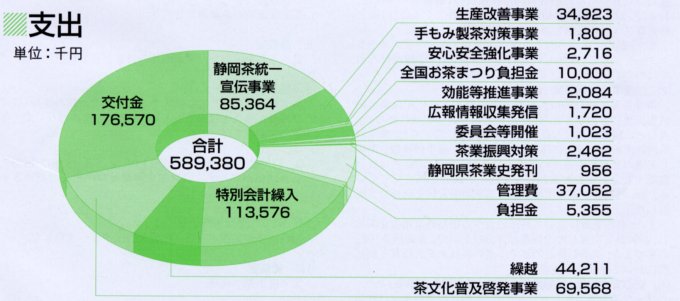 1.茶業振興総合対策事業 (1)静岡茶統一宣伝事業 ①消費地におけるイベント等でのPR ②県内におけるイベントの開催 ③グリーンティーツーリズム ④静岡茶処特集版情報誌の制作 ⑤緑茶教室の開催 ⑥喫茶楽塾(提案型体験緑茶講座)の開催 ⑦静岡茶販売促進支援事業 (2)生産改善対策事業 (3)安心安全強化・新需用創造事業(新需要創造事業) (4)手もみ製茶対策事業 2.委員会等開催費 3.広報・情報収集、発信事業 (1)茶業会議所広報の発行 (2)情報収集及び情報発信 4.茶効能等推進事業 5.茶業振興対策事業 6.全国お茶まつり対策事業負担金 7.管理費 8.負担金 9.特別会計繰入 10.交付金 (県茶商 95,559千円、経済連 81,011千円) 11.茶文化普及啓発事業 12.繰越金 |