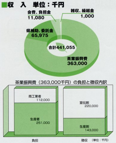 茶業振興費は、良質茶の生産・消費宣伝など、本県茶業のより安定 的な発展をはかることを目的として生産割茶業振興費と宣伝割茶業 振興費が生産者、商工業者の皆様から納入されております。 生産割茶業振興費は生産者に村する割当制となっており、静岡県経 済連が徴収をし、一括して静岡県茶業会議所へ納入していただきます。 宣伝割茶菓振興費の賦課基準については、平成14年度から変更する こととなりました。従来は、荒茶取引額(粉引き額を含む)に対して 生産者(売り手)0.18%、商工業者(買い手)0.18%を負担していただ き、計0.36%が商工団体を通じて納入されていましたが、改正により 粉引き後の荒茶取引額に対して、生産・商工業者がそれぞれ0.18%計 0.36%を商工団体を通じて納入していただくことになりました。 県外移入茶についても県内茶に準じて宣伝割茶業振興費の徴収を 行います。 茶業振興発展を図るために、生産者、商工業者の皆様には、格段の ご理解とご協力をいただきますようお願い申し上げます。 |