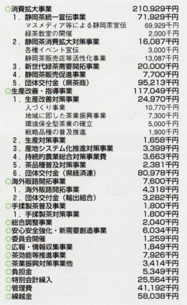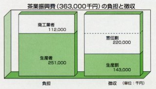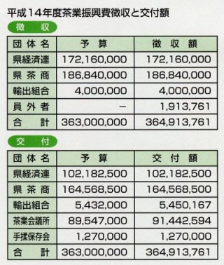 平成15年6月19日(木)、茶業会館において通常総会が開催され、次のとおり承認されました。 皆様の茶業振興費はこのように使われました。 皆様のご協力によりまして納入された、平成14年度茶業振興費は3億6,491万3千761円となり 次のとおり交付され各事業へ有効に使われました。 |