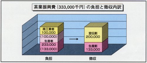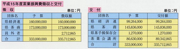平成16年6月21日(月)茶業会館において通常総会が開催され、次のとおり承認されました。 皆様の茶業振興費はこのように使われました。 皆様のご協力によりまして納入された、平成15年度茶業振興費は、3億3,571万2,865円となり 下記のとおり交付され各事業へ有効に使われました。 |