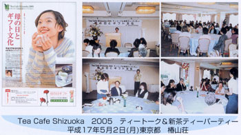 首都圏を中心に、生活者の視点にたち「静岡茶」の良さをPRするシンポジウムイベントを実施しました。 昨年好評であった母の日ギフトと新茶PRのため、東京の椿山荘において「ティートーク&新茶ティ ーパーティー」を実施し、今後も東京の有名ホテルや観光スポットにおいて、年間を通じてイベン トを開催し静岡茶をPRしていきます。 |