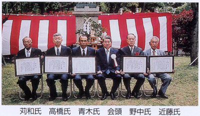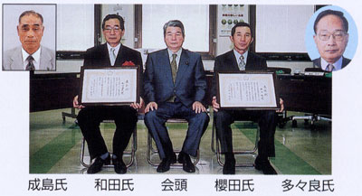 ■茶業功績者表彰(敬称略) 成島 清(71) 多々良浩書(67) 和田 宜久(63) 櫻田 勲(62) ※成島氏は平成17年7月9日 ご逝去されました。謹んで ご冥福をお祈りいたします。 |