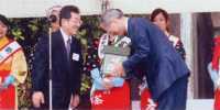 | 4月20日、静岡県舞台芸術公園(静岡市駿河区)で開催された「静岡新茶初摘み大茶会」の席上で、 今年の新茶が県内茶産地の茶娘から、県知事へ贈呈されました。 |