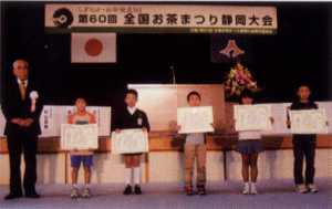 | 夏休みを募集期間として平成18年9月15日に締め切り、平成18年10月4日に審査会を実施し、大賞12点、優 秀賞24点、佳作207点を決定した。この結果にもとづき、11月10日(金)全国お茶まつり静岡大会式典にて表彰式 を行った。受賞作の展示は、全国お茶まつり会場内に大賞と優秀賞36点を展示するとともに、佳作をふくめた全 受賞作品を掲載した「2007年版カレンダー」を作成し、県内茶業関係者、県内全小学枚542校へ配布しました。 |