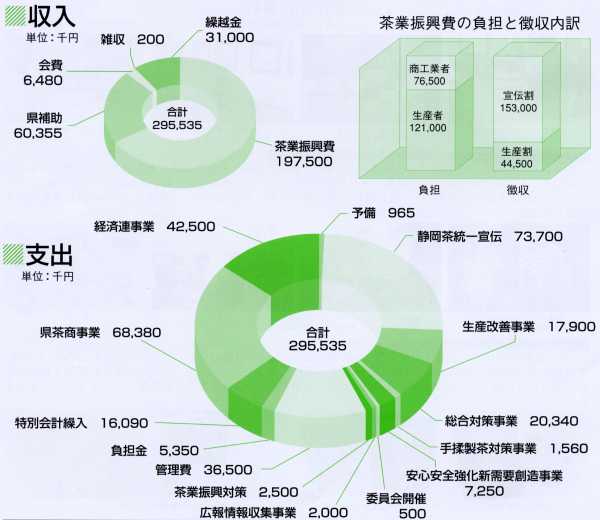 平成19年度の茶業会議所一般会計予算額は、茶業振興費や県補助金などを合わせ 2億9千5,535円となりました。 |