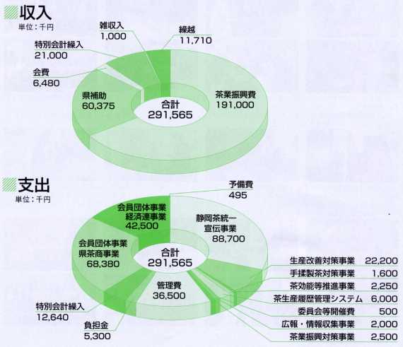 平成20年度の茶業会議所一般会計予算額は、茶業振興費や県補助金などを合わせ 2億91,565千円となりました。 |