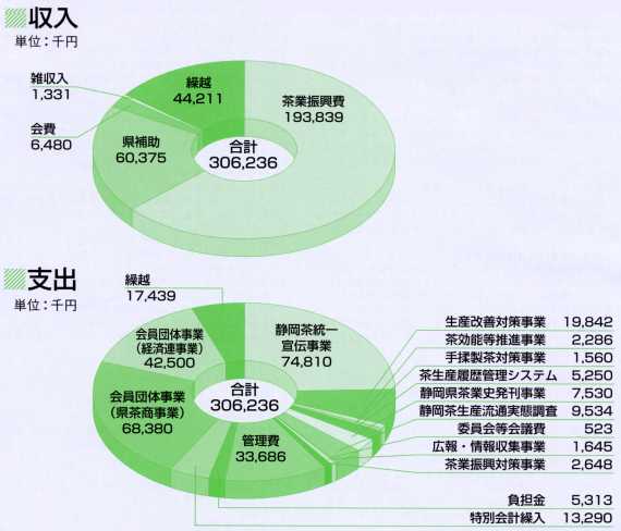 1.茶業振興総合対策事業 (1)生産改善対策事業 (2)静岡茶統一宣伝事業 @グリーンティー・ツーリズム A静岡茶処特集版情報誌の制作 B緑茶教室の開催 C喫茶楽塾(提案型体験緑茶講座)の開催 D静岡茶おもてなしコンベンション事業 E消費地茶専門店活性化対策事業 Fマイボトルキャンペーン G第2回小学生絵画コンクール (3)手もみ製茶対策事業 (4)総合調整対策事業 @静岡県茶業史発刊事業 A静岡茶生産流通等実態調査 (5)安心安全強化・新需要創造事業 @茶効能等推進事業 A茶生産履歴管理システム構築事業 2.委員会等開催 3.広報・情報収集、発信事業 4.茶業振興対策事業 5.管理費 6.負担金 7.特別会計繰入 8.会員団体事業費 9.繰越金 |