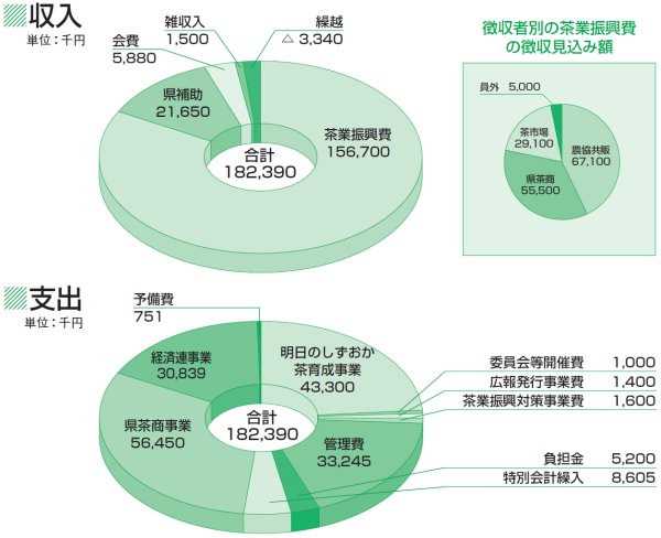 平成22年度の茶業会議所一般会計予算額は、茶業振興費や県補助金などを合わせ 1億8,239万円となります。 |
