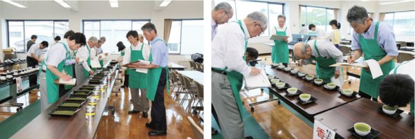 本会では、緑茶の賞味期限についての目安となるデータを得るため「賞味期限調査」を実施している。 大海で保存した荒茶や窒素充填していない個包装袋の仕上げ茶などを3年間に亘り色や香り味などの 変化をデータ収集する。このほど、平成22年6月8日(火)静岡茶市場において2年経過したお茶につ いて官能審査会を実施した。 |