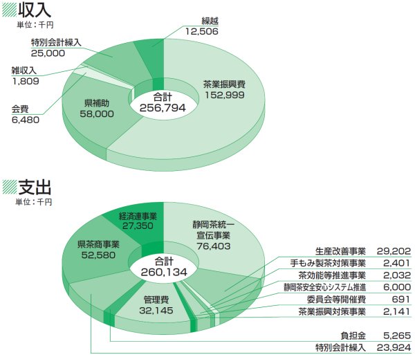 1.茶業振興総合対策事業 (1)生産改善対策事業 (2)静岡茶統一宣伝事業 @提案型緑茶講座(喫茶楽塾)の開催 Aマイボトルキャンペーン B地産地消普及事業 Cグリーンティー・ツーリズム D広報・情報収集・発信事業 E静岡茶おもてなしコンベンション事業 F消費地茶専門店活性化対策事業 G富士山静岡空港対策事業 H第4回小学生絵画コンクール (3)手もみ製茶対策事業 (4)安心安全強化・新需要創造事業 @茶効能等推進事業 A静岡茶安全安心システム推進事業 2.委員会等開催 3.茶業振興対策事業 4.管理費 5.負担金 6.特別会計繰入 7.会員団体事業費 |