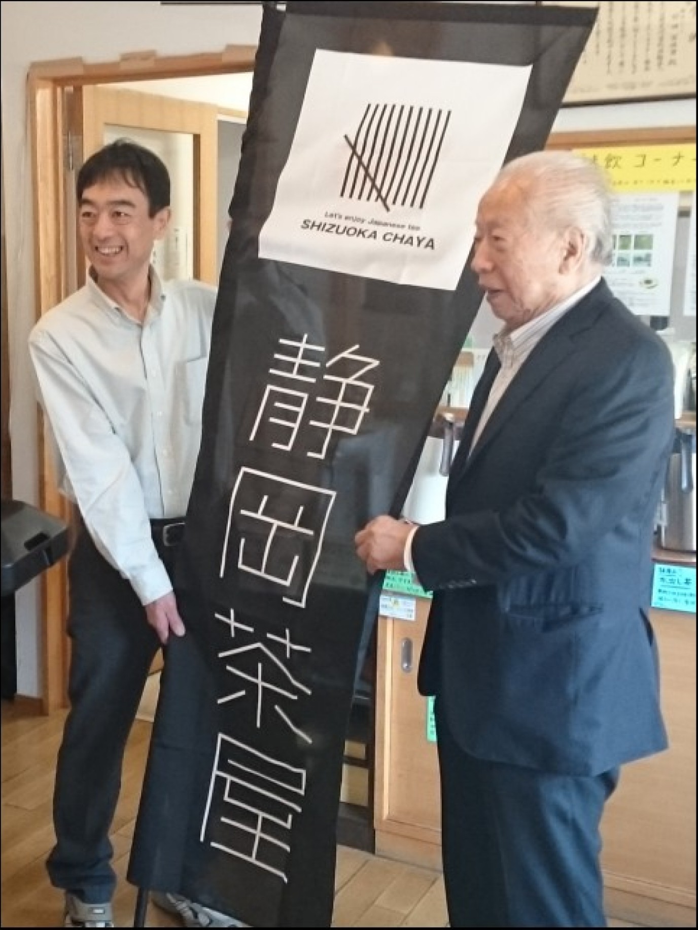 「静岡茶屋」の1号店として認定された「茶町KINZABURO(キンザブロウ)」(静岡市葵区土太夫町)に、茶の知識を持ち、本格的な静岡茶を気軽に提供できる認定店の証となるのぼり旗を、榛村純一会頭から前田冨佐男氏 (前田金三郎商店店主)へ贈った。