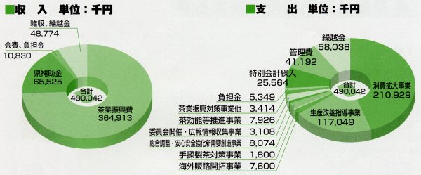平成15年6月19日(木)、茶業会館において通常総会が開催され、次のとおり承認されました。 皆様の茶業振興費はこのように使われました。 皆様のご協力によりまして納入された、平成14年度茶業振興費は3億6,491万3千761円となり 次のとおり交付され各事業へ有効に使われました。 |